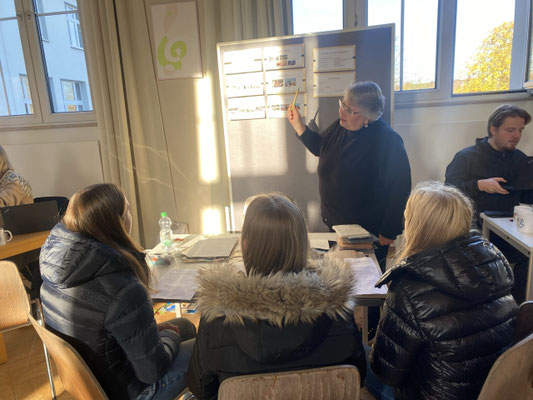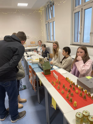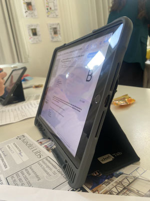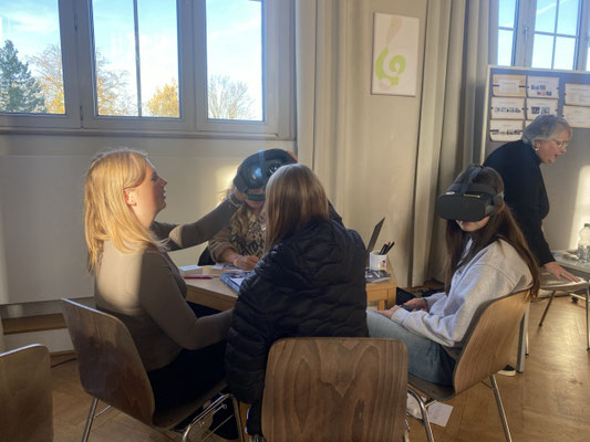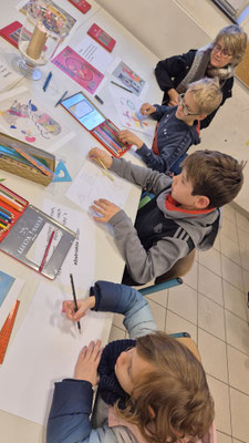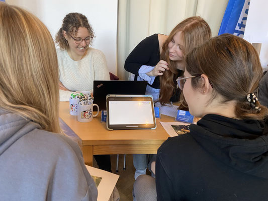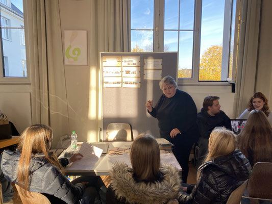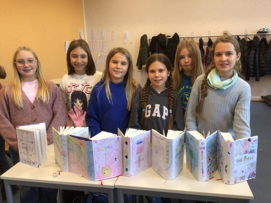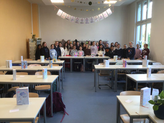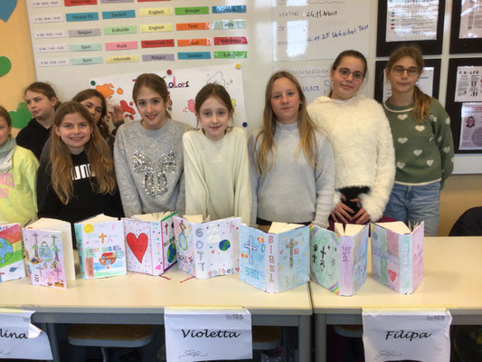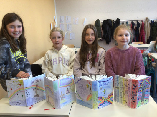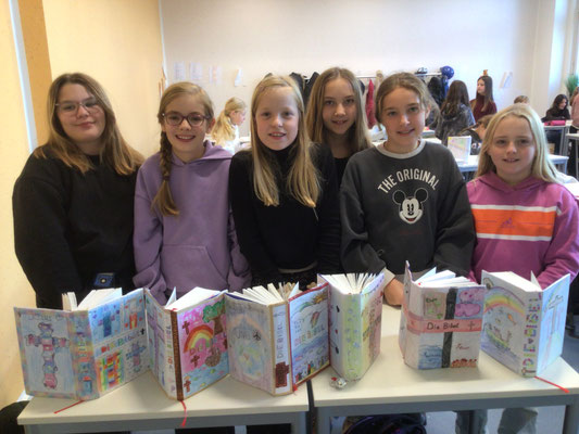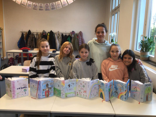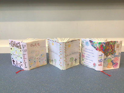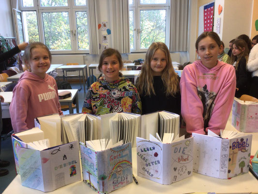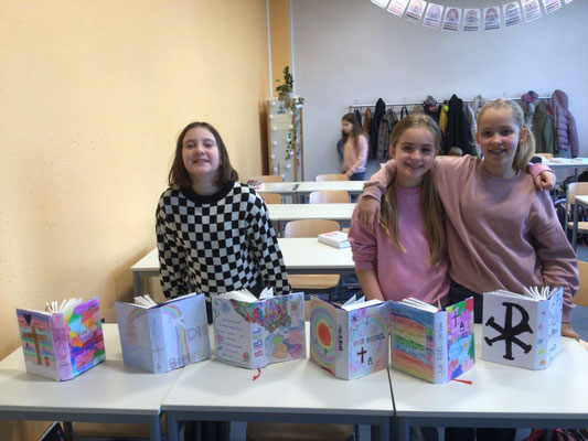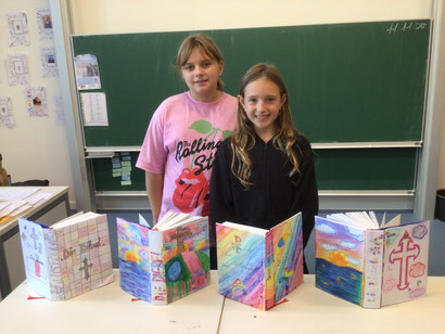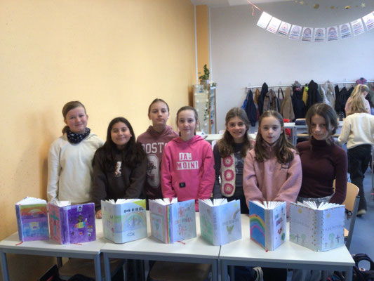 Im Anschluss präsentierten die Schülerinnen ihre Werke bei einem „Museumsrundgang“ im Klassenraum. Gemeinsam wählten die Klassen anschließend die drei schönsten Bibelumschläge aus.