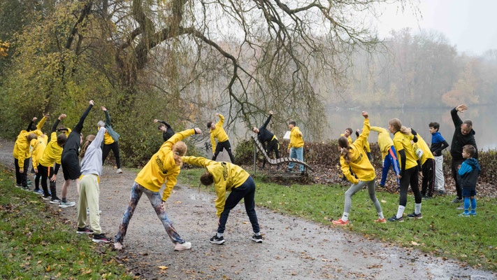 der Klassen fünf bis zehn vor der Sporthalle. Das Training erfolgt rund um den Stadtwerke-Sportpark in Ratingen. „Wir ziehen uns in den Umkleidekabinen des Sportplatzes um und trainieren im