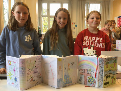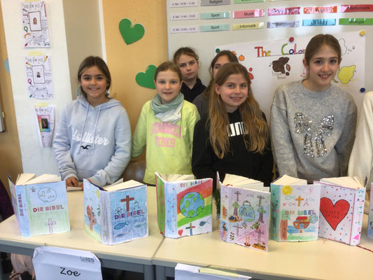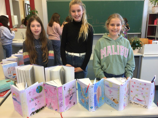 Im Foto sieht man die 3 Gewinner-Bibeln aus der 5c (Emma Bastron, Joana Ciurcanu, Emely Leisten)