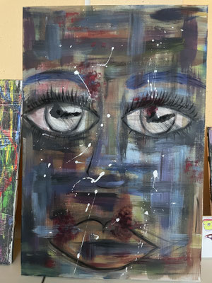 kleine oder überdimensionale Bildformate: Ängste und visuelle Anhaltspunkte für ihre Überwindung schwingen in allen Bildern mit. So blickt im Werk der Schülerin Zaria Hinsen aus der 10d ein