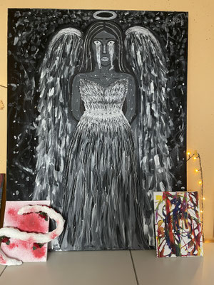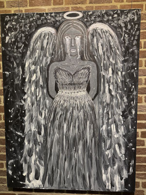 leidender weiblicher Engel mit gigantischen Flügeln, in melancholisch anmutenden Grau- und Schwarztönen eindrucksvoll gestaltet, dem Betrachter auf einer großformatigen Bildfläche sorgenvoll und