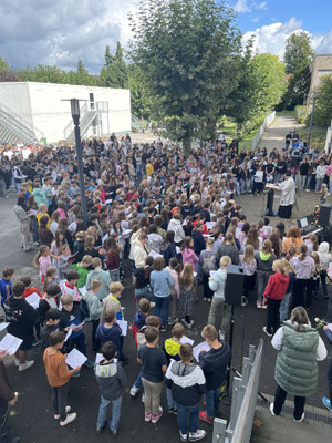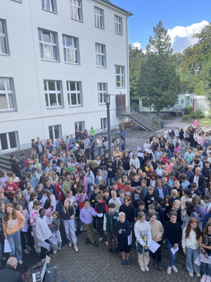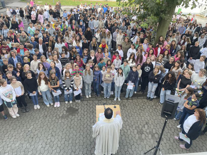 Ein stimmungsvoller Gottesdienst der gesamten Schulgemeinde auf dem Schulgelände unter freiem Himmel rundete das Patronatsfest der Liebfrauenschule ab, das im Namen der Rose in ganz Ratingen für Aufmerksamkeit und Anerkennung gesorgt hatte.