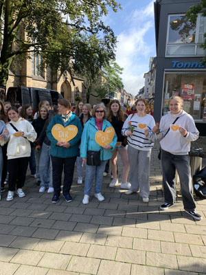 Auf der Marschroute der LFS-Schüler*innen lagen die folgenden 23 Institutionen samt der Menschen, die sich mit ihren helfenden Händen dahinter verbergen: Kindergarten St. Suitbertus, St. Marien Seniorenhaus, Blaue Engel, DRK-Ortsverein RatIngen, Seniorenzentrum 360°, Allianz Bildung & Lernen, Forum Lotsenpunkt, Polizeiwache Ratingen, Liebfrauenkindergarten, Haus Salem, Statt Café (Diakonie), Feuerwehr Ratingen, Tafel, Kiga Heilig Geist, Kiga St. Marien, Herz Jesu Kiga, Boje, Pfarrbüro + Kirche St. Peter und Paul, Rock & Rolli SKF, Möbelkammer SKF, Freiwilligen Börse Ratingen, Hospizbewegung, Lebenshilfe Mettmann Wohnheim.